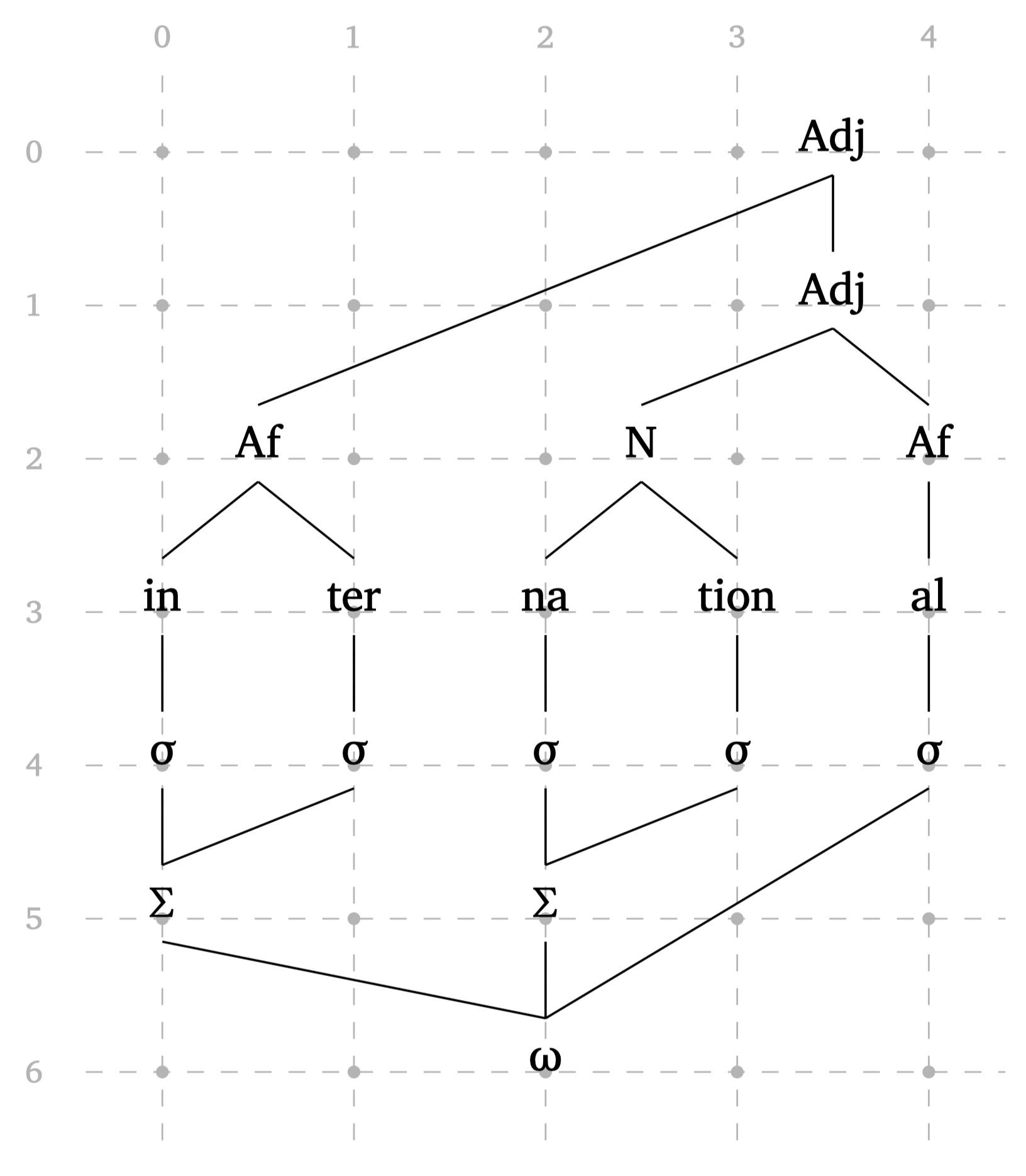 Certain phonological structures have too many degrees of freedom for a single-purpose function to be enough. This is why the function #multi-tier() exists (introduced in version 0.4.0): it gives you the freedom to create a wide range of non-linear structures. It is much more flexible, but that comes with more complicated syntax and more arguments, by definition. Figure 6, adapted from Booij (2012), illustrates a scenario where we need more flexibility in a function to generate a multi-tier representation.